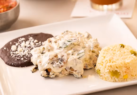 Grilled chicken breast, sautéed poblano peppers, mushrooms, sour cream sauce, black beans, and Spanish rice.